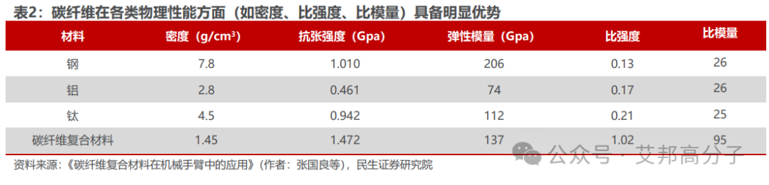 碳纖維應用于機器人輕量化結構材料,主要優勢體現在: