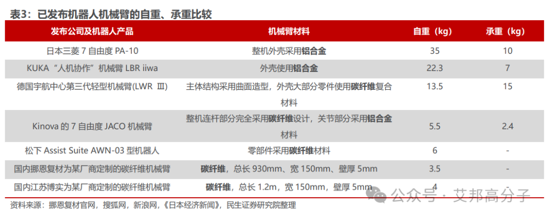 碳纖維在人形機器人中的應用主要在于機械臂,國內機構分析相關產品證明使用碳纖維復材制作的機械臂整體質量較鋁合金減輕 30%,臂架重心和震動均因此有所降低,有效提升了安全穩定性。