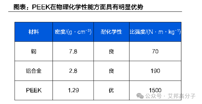 PEEK 性能全面,在剛性方面優于絕大多數特種工程塑料,兼具韌性、機械性能,以及優異的耐熱、耐磨、耐腐蝕性能。PEEK 比強度大、密度低。在滿足強度要求的前提下,PEEK 可以大幅度減小材料本身的自重,成為實現輕量化的解決方案,工業領域“以塑代鋼”應用空間廣闊。