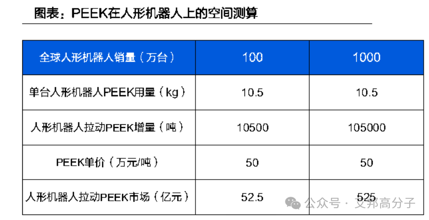 預計在人形機器人 1000 萬臺的需求下,使用 PEEK 實現輕量化將拉動 10.5 萬噸的 PEEK 增量,帶來 525 億元的 PEEK 市場規模。