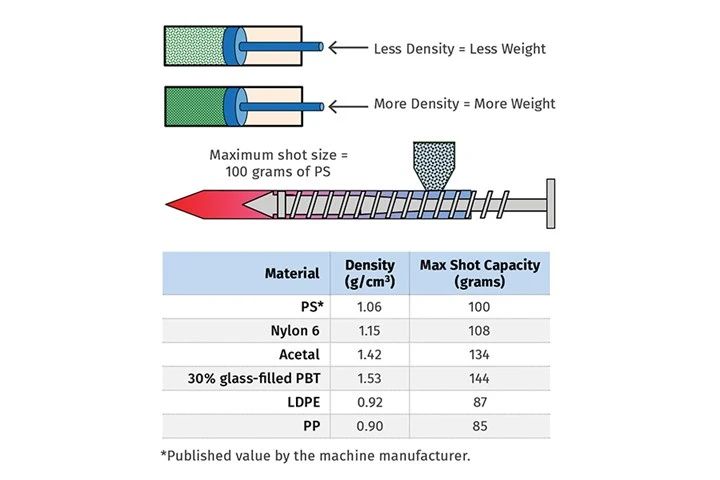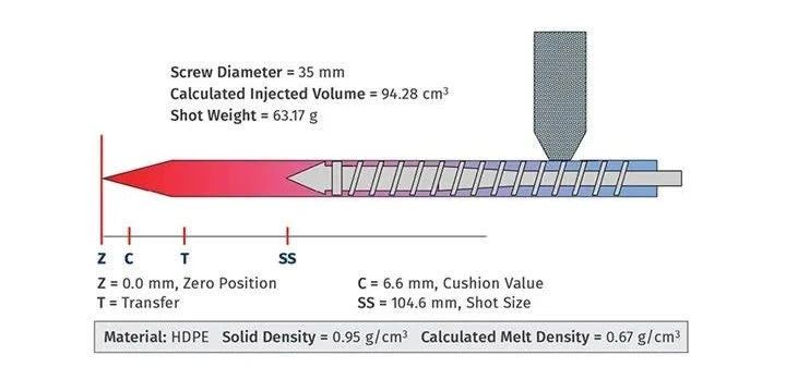 料筒的使用百分比應基于料筒容量并考慮正在成型的材料。因此,了解密度值對于此類計算至關重要。