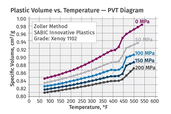 壓力-體積-溫度(PVT)圖(跟蹤壓力和溫度變化時材料體積的變化)通常用于確定材料的熔體密度。